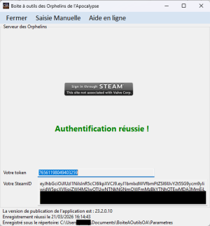 1. Cliquez sur Connexion via Steam ou Connexion via Epic 2. Votre navigateur s’ouvre automatiquement 3. Connectez-vous sur la plateforme 4. Validez l’authentification 5. Revenez dans la Boîte à Outils