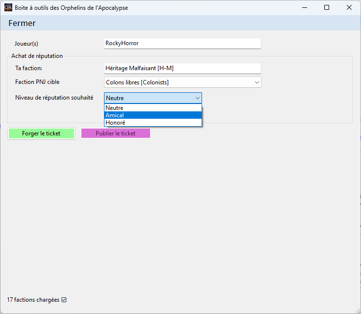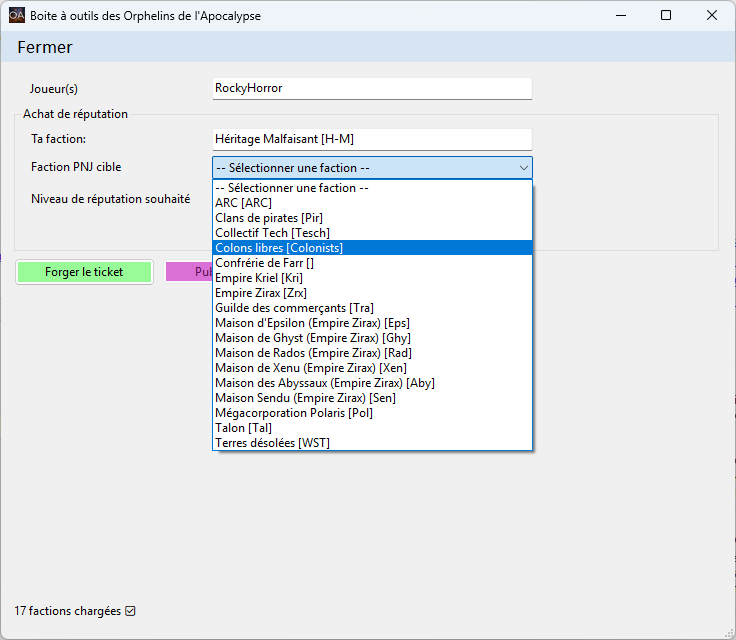 * sélection de la faction PNJ * choix du niveau de réputation * calcul automatique du coût