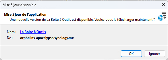 Au lancement, si une nouvelle version est disponible, une fenêtre Mise à jour disponible s'affiche automatiquement. Elle indique :