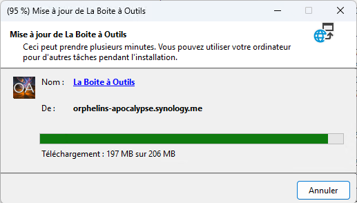 La Boîte à Outils (BAO) se met à jour automatiquement via ClickOnce. Lorsqu'une nouvelle version est disponible sur le serveur de la communauté, une fenêtre de mise à jour s'affiche au lancement de l'application. La mise à jour se fait en deux étapes et ne nécessite aucune désinstallation préalable.