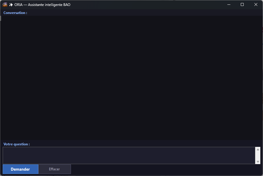 Pour poser une question à ORIA, saisissez votre texte dans le champ Votre question en bas de la fenêtre, puis cliquez sur Demander ou appuyez sur la touche Entrée. Pour insérer un saut de ligne dans votre question sans l'envoyer, utilisez Maj+Entrée. ORIA accepte les questions formulées en langage naturel. Exemples de questions valides : "Comment ajouter un emplacement de ressource ?", "À quoi sert le trigramme d'une faction ?", "Comment mettre à jour la BAO ?".