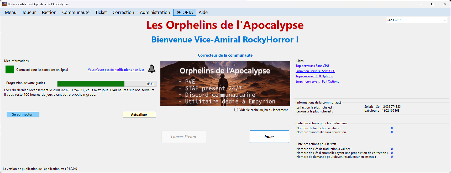 ORIA (ORphelins de l'Apocalypse Intelligence Artificielle) est l'assistante intégrée à la Boîte à Outils (BAO) de la communauté des Orphelins de l'Apocalypse. Son rôle est de permettre aux joueurs de poser des questions en langage naturel sur la BAO et d'obtenir des réponses basées sur la documentation officielle du wiki. ORIA est spécialisée exclusivement sur la BAO et le serveur des Orphelins de l'Apocalypse : elle ne répond pas à des questions générales sur Empyrion ni à des sujets sans lien avec la communauté. Tout le traitement est réalisé sur l'infrastructure des Orphelins de l'Apocalypse, sans recours à aucun service cloud externe.